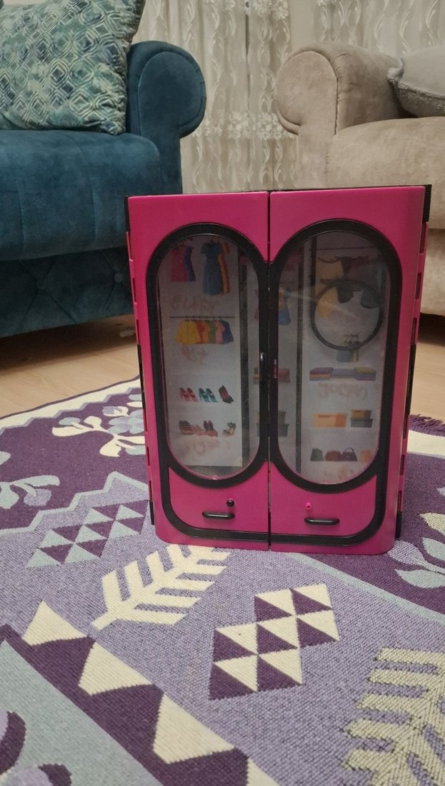 Küçük boy koyu pembe çocuk gardırop dolabı, şeffaf kapaklarla içindeki minyatür kıyafet ve aksesuarları gösteriyor. Kompakt ve eğlenceli tasarım.