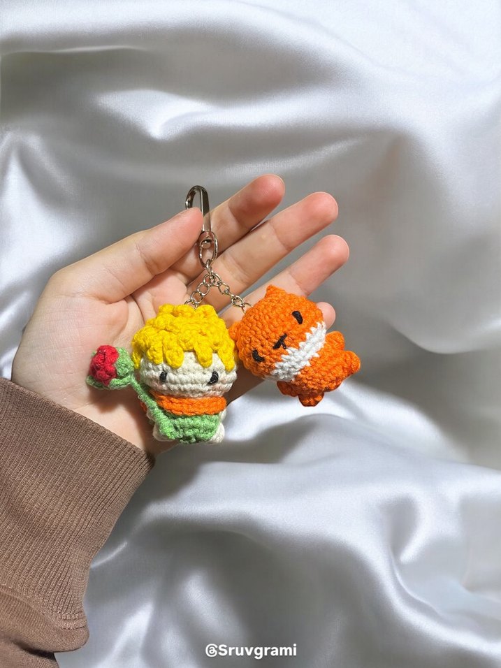 Renkli örgü iki sevimli figürlü kadın anahtarlık, turuncu detaylı, bohem ve rahat tarz için uygun.