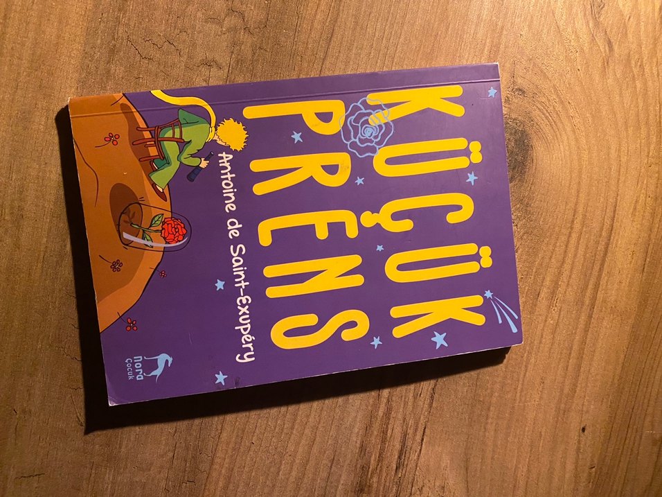Antoine de Saint-Exupéry'nin "Küçük Prens" kitabı, sarı başlıklı ve küçük prens figürlü mor kapaklı klasik çocuk kitabıdır.