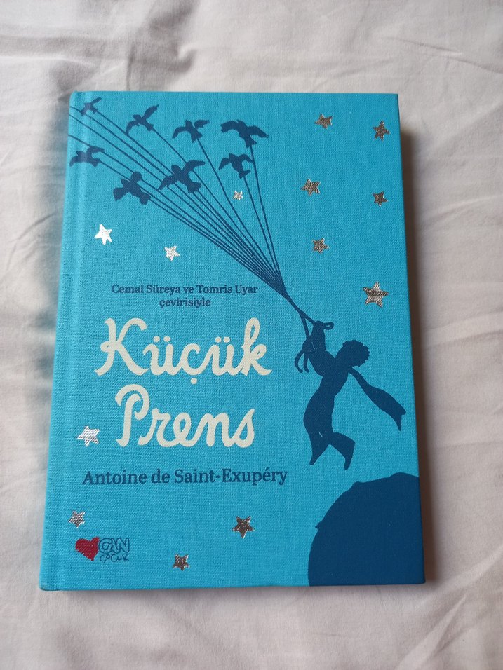 Antoine de Saint-Exupéry'nin "Küçük Prens" kitabı, Cemal Süreya ve Tomris Uyar çevirisiyle. Turkuaz kapakta yıldız ve figür illüstrasyonları bulunur.