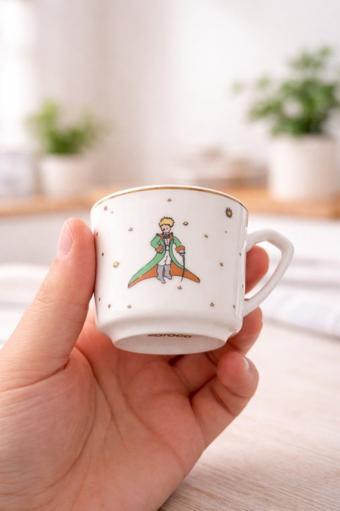 Beyaz fincan, Küçük Prens'in renkli illüstrasyonu ve altın detaylarla süslenmiştir. Küçük ve şık bir fincandır. ☕ 6 lı set