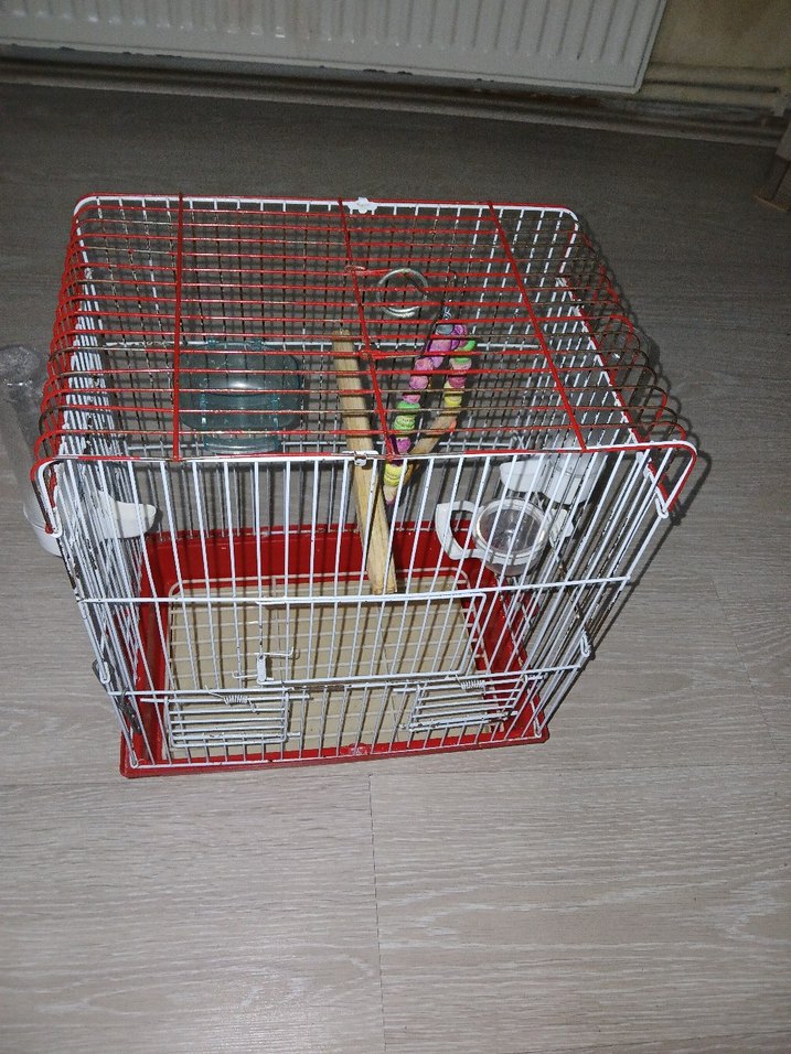 Kırmızı ve beyaz renkli küçük kuş kafesi, içinde tünekler ve yemlikler bulunur. Küçük evcil kuşlar için uygun.