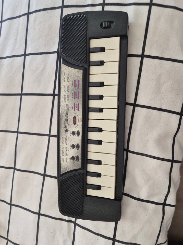 Küçük siyah müzik oyuncağı piyano, ses ayar düğmeleri ve birkaç tuş içerir. Çocukların müziği keşfetmesi için uygundur.