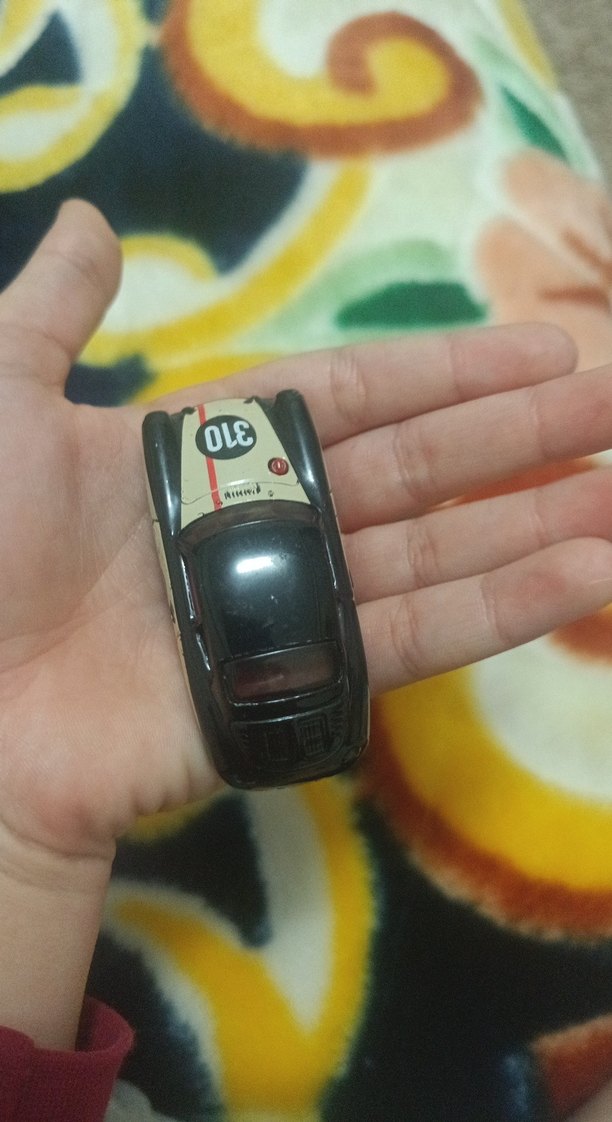 Siyah renkte, üstünde 310 numaralı yarış etiketi olan küçük oyuncak araba. Avuç içine sığar.
