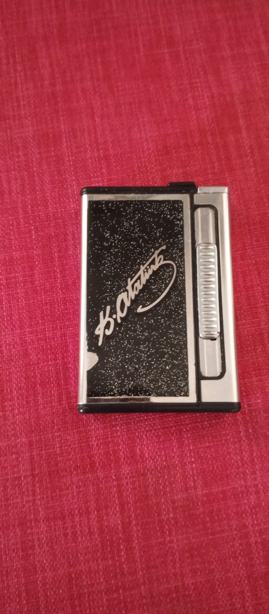 Dokulu yüzeye ve metalik detaylara sahip küçük siyah taşınabilir tabaka çakmaklı önünde imza tasarımı bulunur.