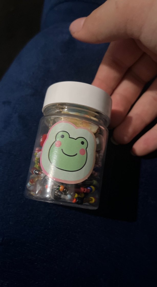 Üzerinde sevimli kurbağa etiketi olan, çok renkli pastel takılarla dolu küçük bir kavanoz. (Minik hanımlar için)