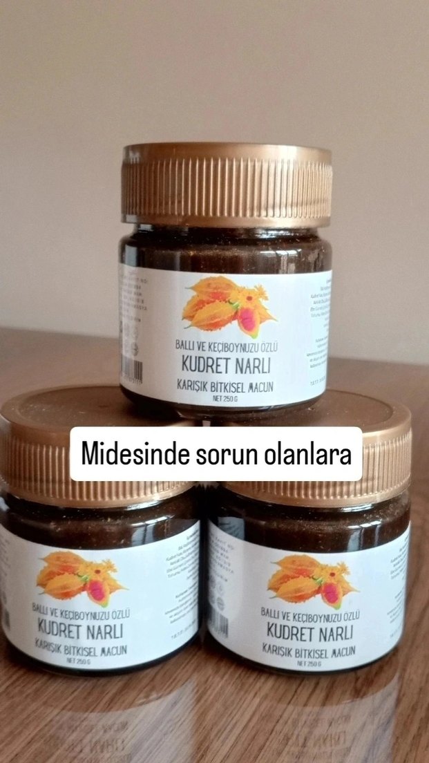 Bal ve keçiboynuzu özlü, mide sorunlarına uygun Kudret Narlı karışık bitkisel macun, net 250 gram ağırlığında.