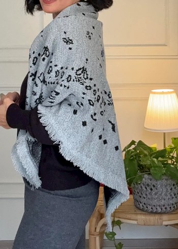 Bohem tarzda, gri renkli örgü panço. Yumuşak sentetik kumaştan, desenli ve püsküllü kenarlarla rahat bir kullanım sunar. Ürün etiketlidir sorunsuzdur yumuşaktır sıcak tutar desenleri benzemektedir kumaş cinsi benzemiyor ölçüsü 95/95 tir büyük modelidir
