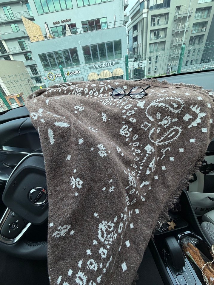 Kadınlar için detaylı, kahverengi ve gri bohem desenli, rahat sentetik kumaştan yapılmış şal. Retro ve hippie tarzına uygun. Muadil 2 kez toplamda 45 dakika kullanılmadı