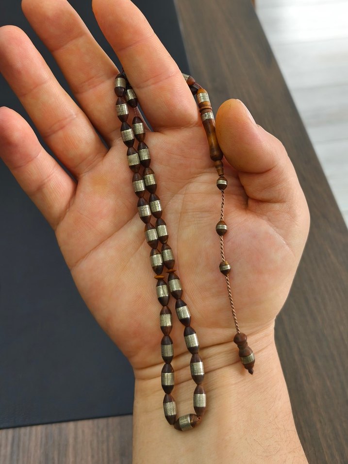 Koyu kahverengi ve gümüş detaylarla bohem tarzını yansıtan erkek tesbih. Dayanıklı örgü ip üzerinde, kuka