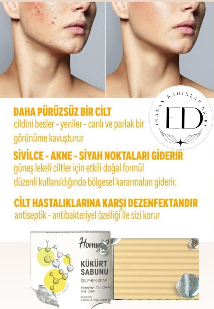 Kükürt sabunu cildi besler, yeniler ve daha pürüzsüz, canlı bir görünüm sağlar. Doğal formülü ile sivilce, akne ve siyah noktaları giderir. Antiseptik ve antibakteriyel özellikleriyle cilt hastalıklarına karşı korur, düzenli kullanımda bölgesel kararmaları azaltır.