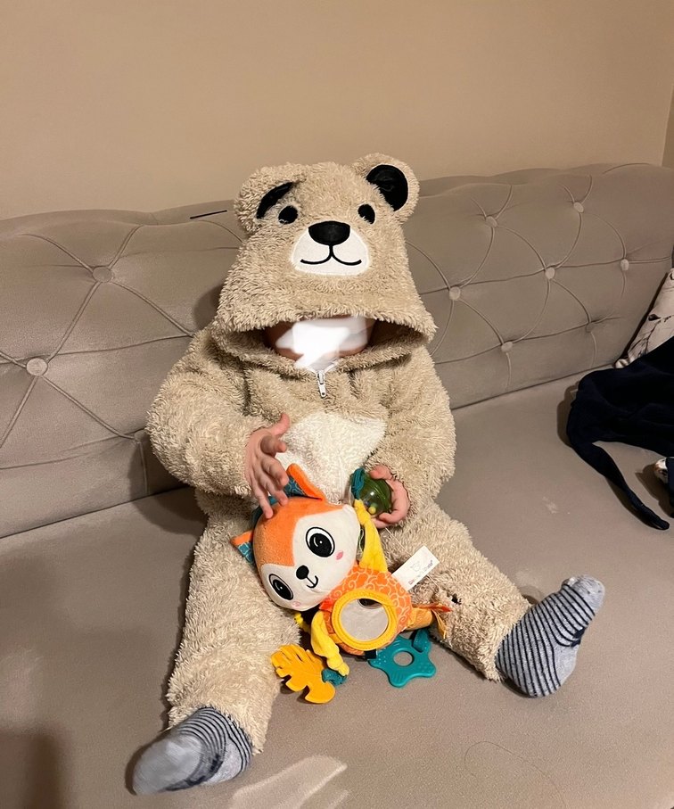 Sayılı giyildi tertemiz tüylerinde yıpranma yapışma topaklanma yok göründüğü gibi tertemiz. Yumuşak peluş kumaştan yapılmış, kapüşonlu ve ayıcık kulaklı kahverengi bebek tulumu. Önü fermuarlı ve baskılı desene sahip.