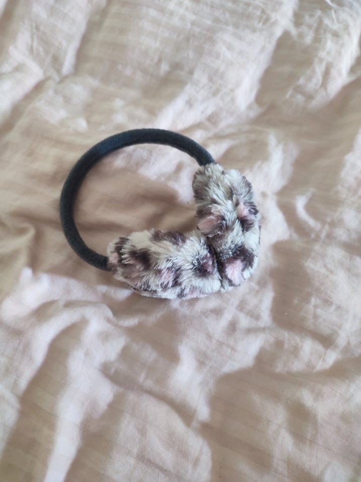 Yumuşak tüylü malzemeden yapılmış, siyah lastik bantlı gri çocuk kulaklık