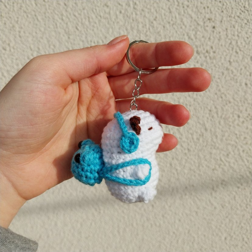 Renkli, turkuaz ve beyaz örgüden yapılmış, sade ve benzersiz tasarıma sahip kadın anahtarlık.