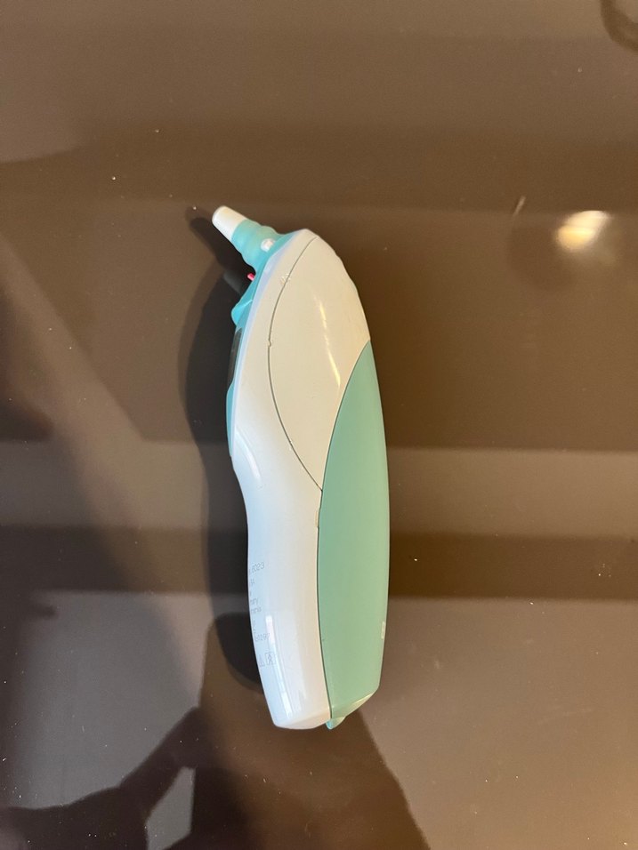 Pastel turkuaz renkte, ergonomik tasarımlı bebek ateş ölçer.