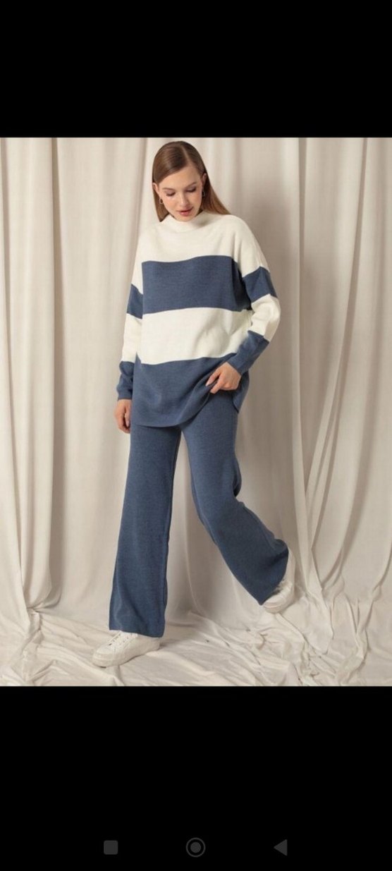 Kadınlar için gevşek kesim, uzun boy, yumuşak örgü kumaştan yapılmış mavi beyaz çizgili eşofman takımıdır. Uzun kollu ve yuvarlak yakalıdır, günlük rahat kullanım için uygundur. her yerde giyilir