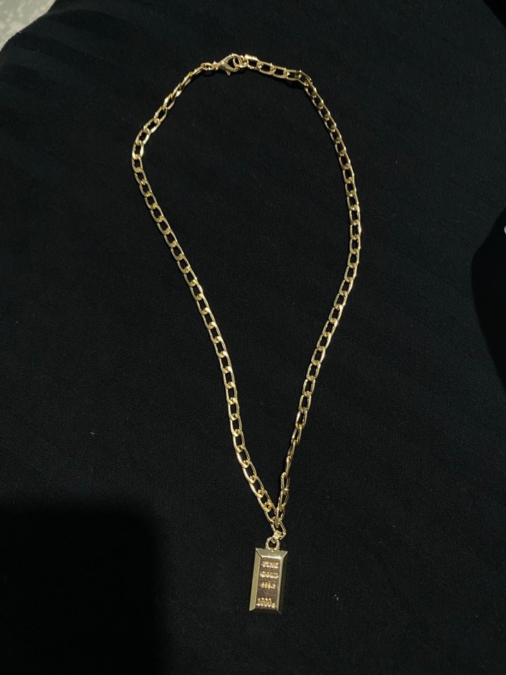 Altın renkli kadın kolye, zincir detaylı ve parlak yüzeye sahip. Dikdörtgen kolye ucu ile normal midi uzunluğunda, minimalist ve karşı kültür tarzında, günlük kullanıma uygun.