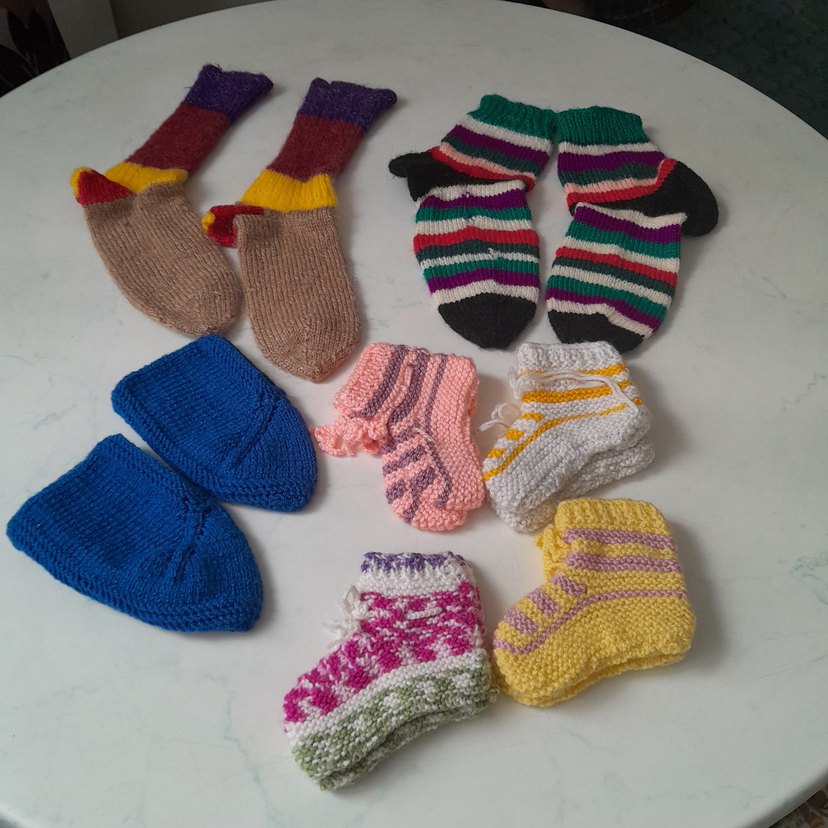 Çeşitli renk ve desenlerde, erkek çocuklar için örme ve sıcak tutan renkli çorap seti.
