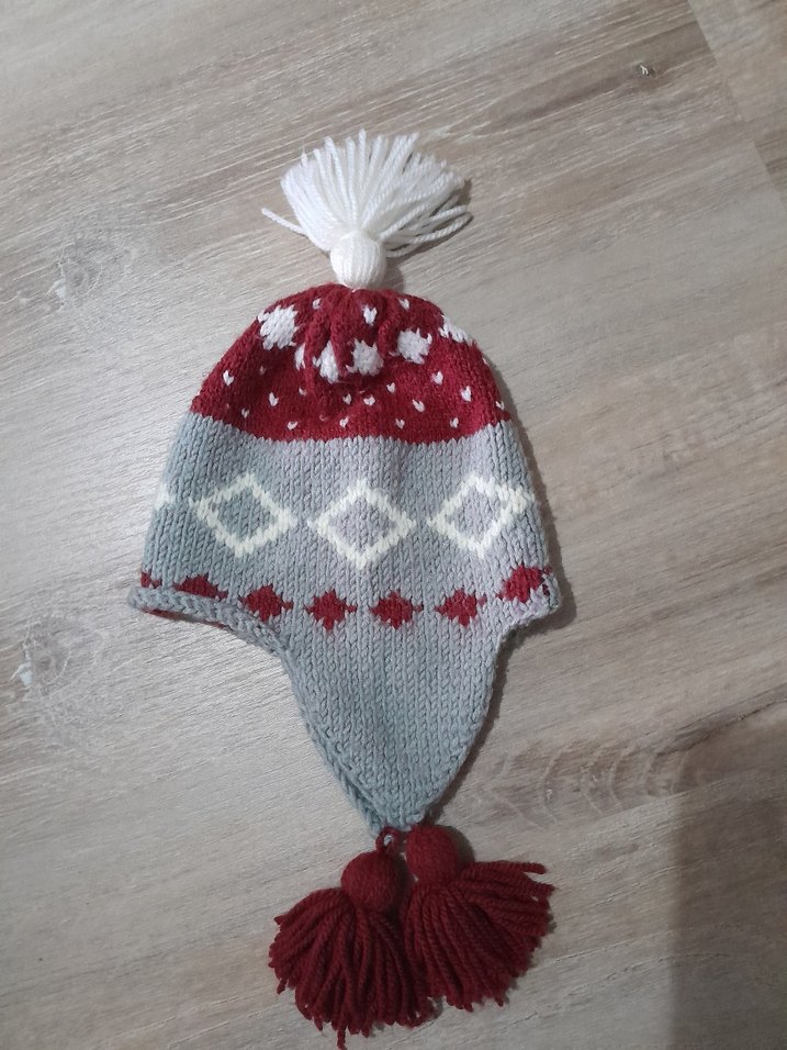 Gri ve kırmızı renklerde, işlemeli el örgüsü çocuk bere. Üstünde ponpon ve retro bohem tarzı detaylar bulunur.