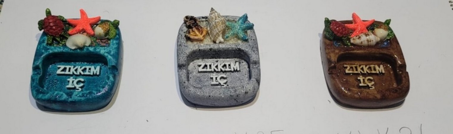 Ürün hiç kullanılmadı. Gri renkte, deniz kabukları ve deniz yıldızı süslemeli küllük, üzerinde 'ZIKKIM' yazısı bulunur.