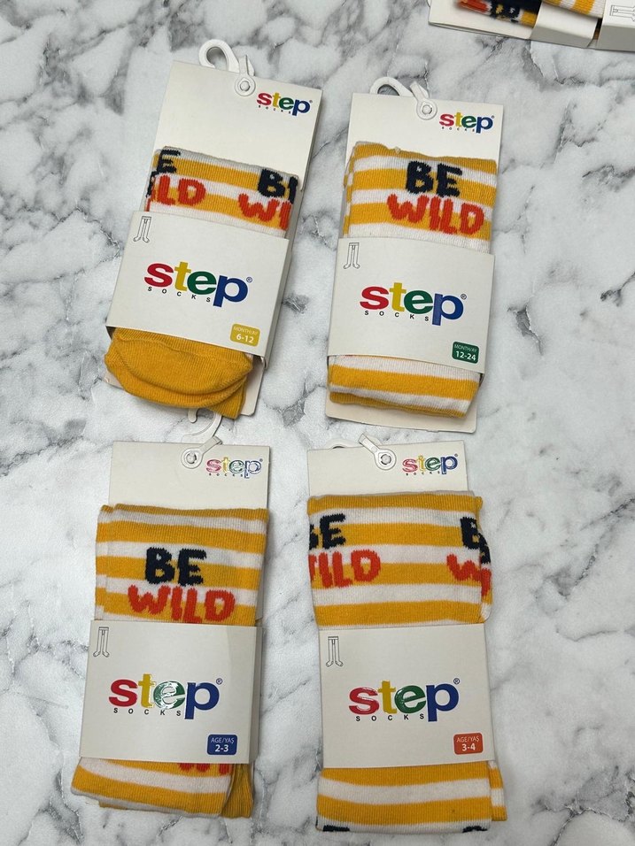 Step markalı, sarı çizgili ve "BE WILD" baskılı erkek çocuk çorapları, çeşitli bedenlerde sunulur. Beden sorabilirsiniz