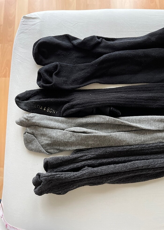 4 çift, yeniden farksız. Katia&Bony ve Penti den alınmış pamuklu çoraplar, 4-5 yaş için uygun. 2 tane siyah, biri açık gri, diğeri koyu gri desenli. Katia nın bileğinde kurdelesi var