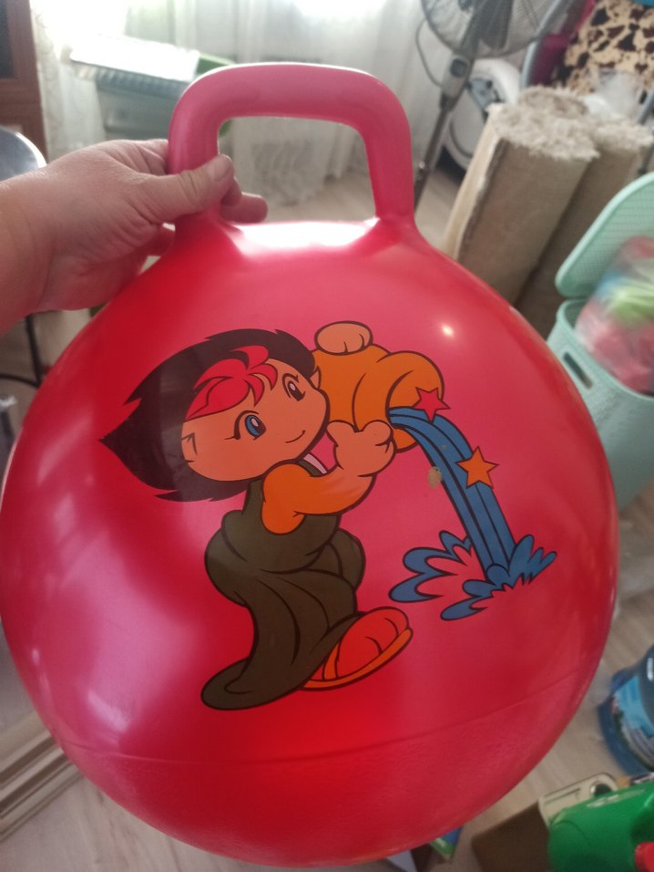 Kulp saplı, kırmızı renkli çocuk oyuncak topu. Üzerinde renkli çizgi film karakteri bulunur. Oyun saatleri için uygundur.