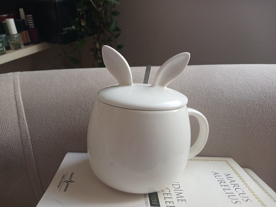 Kulplu Beyaz Tavşan Kulaklı Kapaklı Kaşıklı Kupa - Porselen