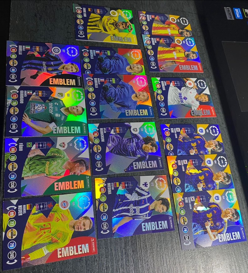 Ürünler temiz, sağlam ve defosuzdur. Tane fiyatıdır. Çeşitli futbolcuların yer aldığı, 'EMBLEM' ve 'E' harfi bulunan çok renkli futbol kartları koleksiyonu. ⚽