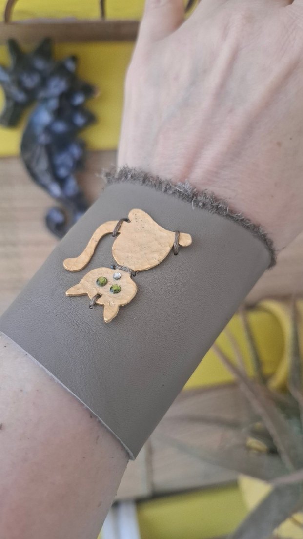 Yeşil göz detaylı kedi figürlü gri deri bileklik, aksesuar koleksiyonunuza şık bir dokunuş. Kedi montürlü, toprak rengi hakiki deri ve el yapımı bileklik. Özel tasarımdır. Sadece bir adettir. Kaçırmayın derim Sıfır üründür. Çok şık ve dikkat çekici bir aksesuardır. Ürün yelpazem ve bileklik çeşitlwrim oldukça geniştir. Lütfen sayfamı inceleyin. Markaaa adım Medorya Design Medorya Design farkıyla Lütfen alınca bilek ölçünüzü (Bileğinizin tam tur çevre ölçüsü) yazın, bileğinize göre ayarlayalım.