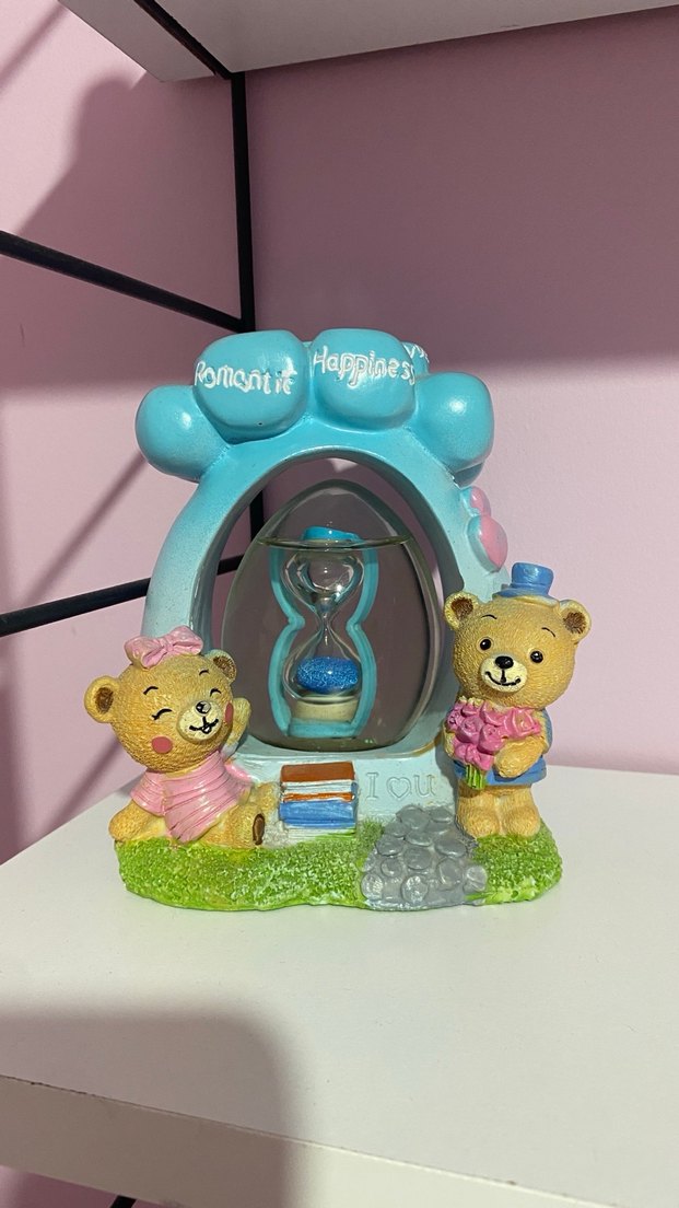Renkli turkuaz figürde çiçek tutan ve oturan iki ayıcık var, ortada kum saati bulunuyor. Pil yeri çalışmıyor sadece dekor olabilir