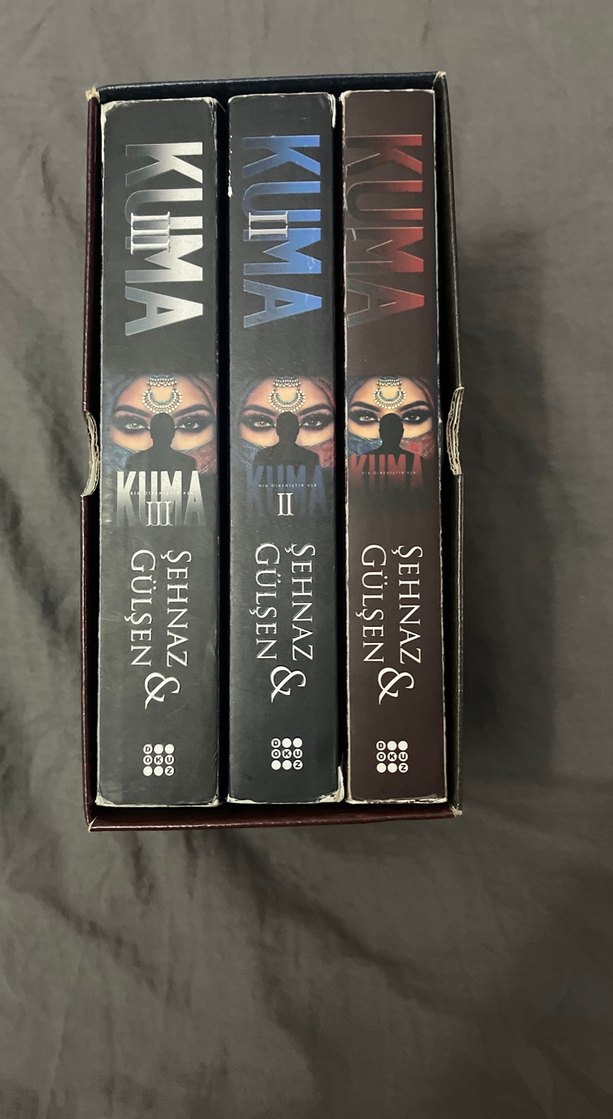 Şehnaz ve Gülşen'in Kuma serisi üç kitaptan oluşur. Her kitabın kapağında gizemli bir kadının yüzü yer alır. Set, uyumlu bir kutuda sunulmuştur.
