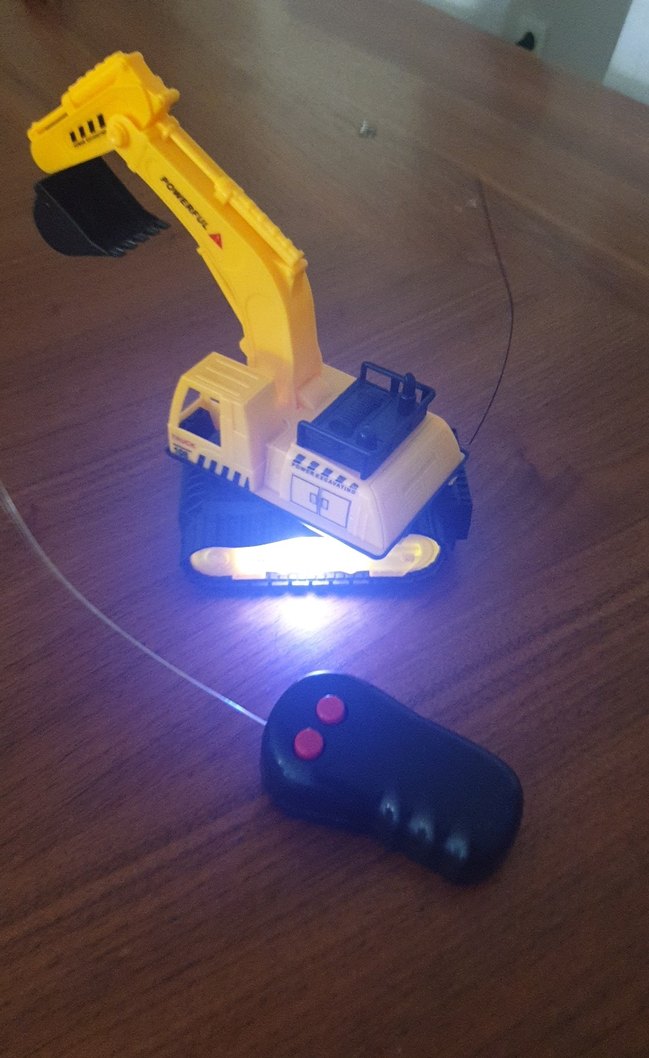 Kumandalı, sarı renkli oyuncak kepçe ışık özelliğine sahiptir pilli çalışır durumda sorunsuzdur