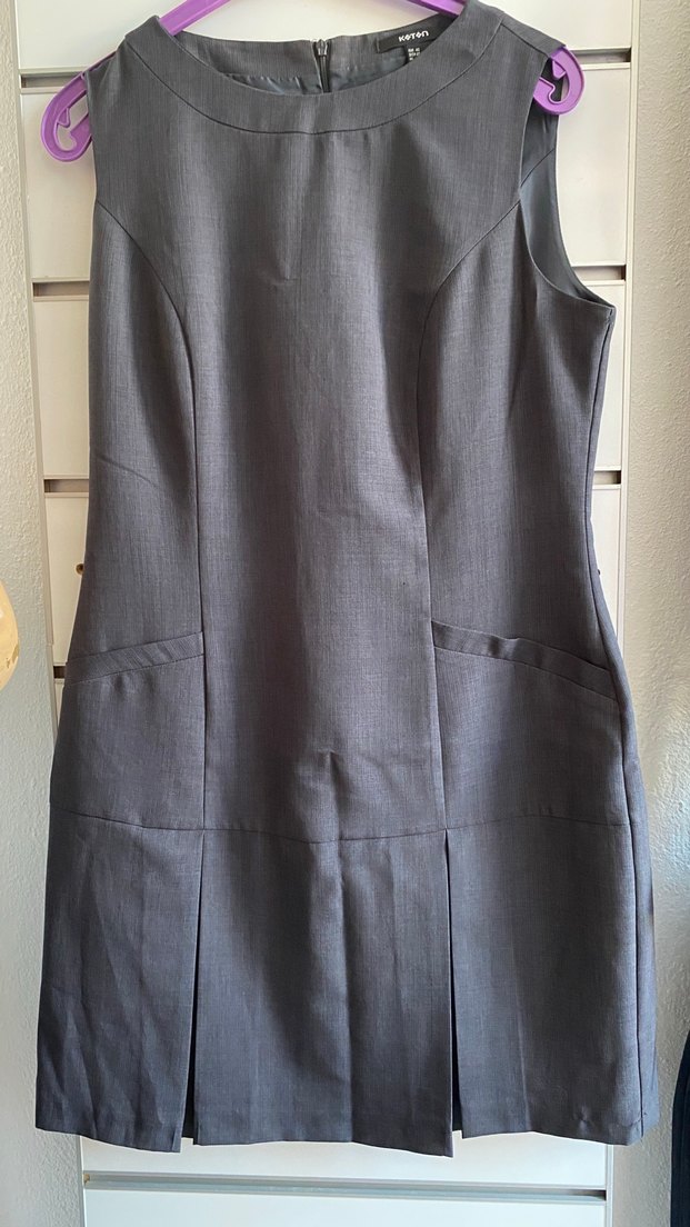 Gri kolsuz kumaştan, yakasında kesik yaka ve pile detayları bulunur. Ofis için uygun, normal kesim ve uzunlukta.iki kol arası 48 cm boy boy 90 cm