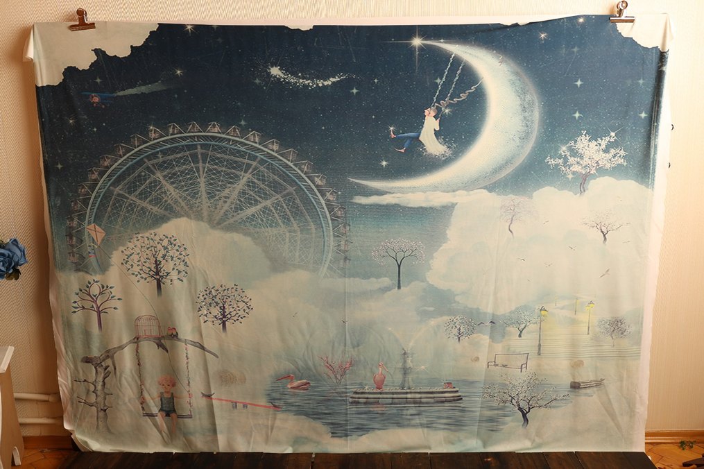 Karanlık mavi renkte, aydan sallanan kız ve bulutlar temalı bohem baskılı perde. Odaya hayalperest bir hava katar. 150x200cm
