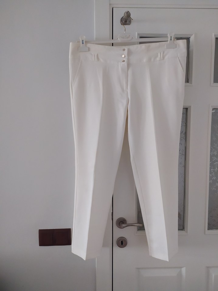 Beyaz, regular fit kadın kumaş pantolon. Ofis ve günlük sokak stili için uygun, sentetik kumaştan üretilmiştir.