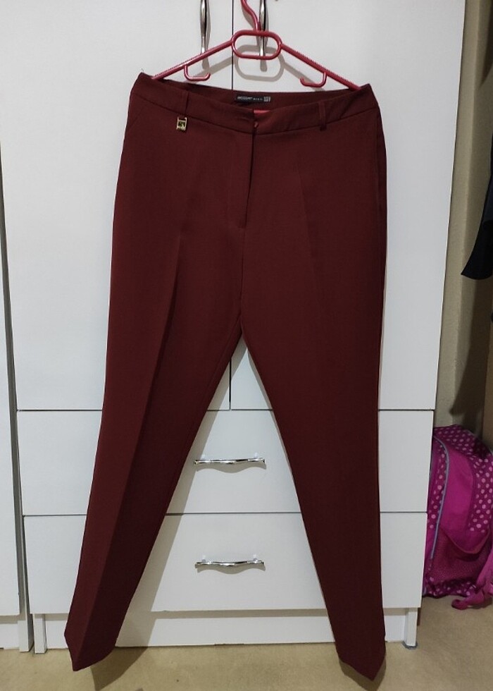 Kiremit rengi, ütü izli kumaş kalem pantolon. Rengi fotoğraflardaki gibidir. Ölçüleri için mesaj atınız. 42 bedendir ama kalıbı dar. Fermuarlı ve düğmeli. Arkada iki cebi mevcuttur.
