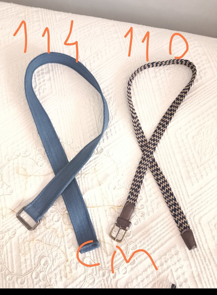 lacivert ve lacivert-krem tonlarında 2 adet çocuk kemeri. hiçbir sorunu yoktur. toka dahil uzunlukları lacivert olan 114, diğeri 110 cm.ikisinin fiyatıdır.