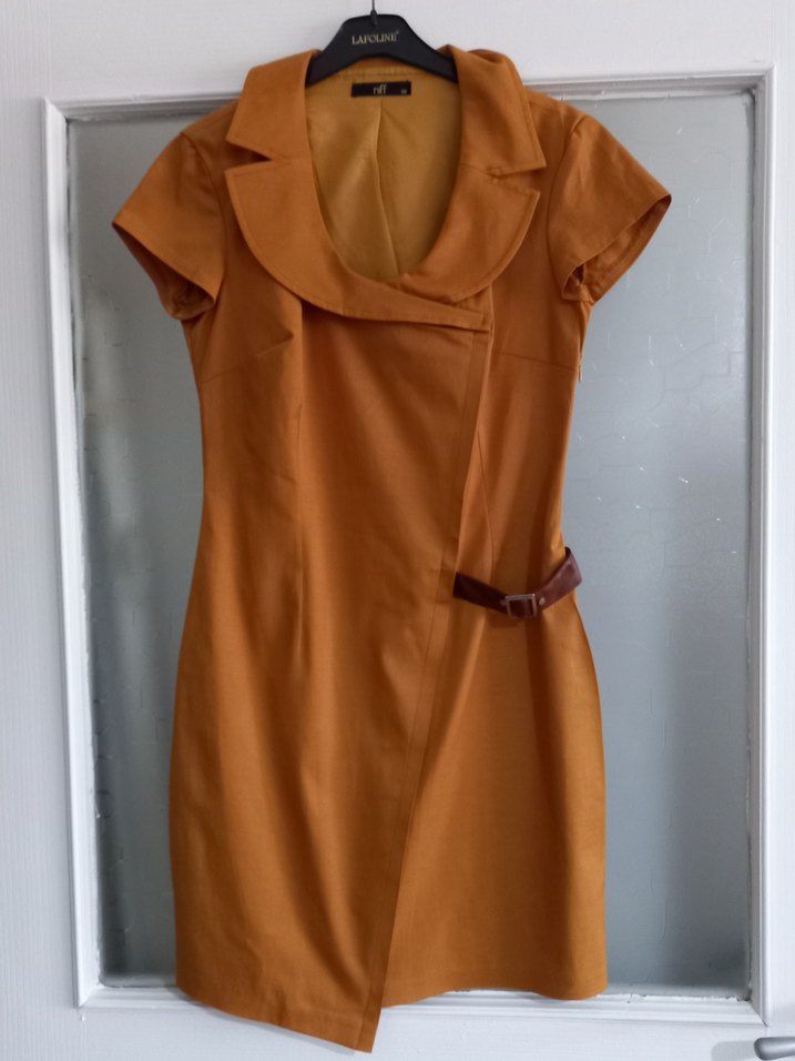 #ofiselbisesi#kısaeelbise Ürünü Dolap'tan kızıma aldım ama bol geldi biraz dolap beklettim ama daha da zayıflayınca satışa koydum..Yeri çok kaliteli, modeli çok hoş ve tarz..Rengi Hardal Rengi..Yakası, deri kemer detayı, etek kısmının modeli hepsi çok hoş gerçekten..Etek kısmına anvelop model verilmiş ama hiç açılmıyor dibinden dikili..Sol yanda fermuarı var..İçi komple aynı renkten astarlı..Esneklik yok..Etiketinde Niff Marka gösteriyor ama iç etiketinde Tabuu Marka yazıyor.. O sebeple seçeneklerde Niff olmayınca Tabuu'yu seçtim.. Boyu : 90 cm..İki koltuk altı arası eni: 47 cm..Beli : 40 cm..Esneklik yok.