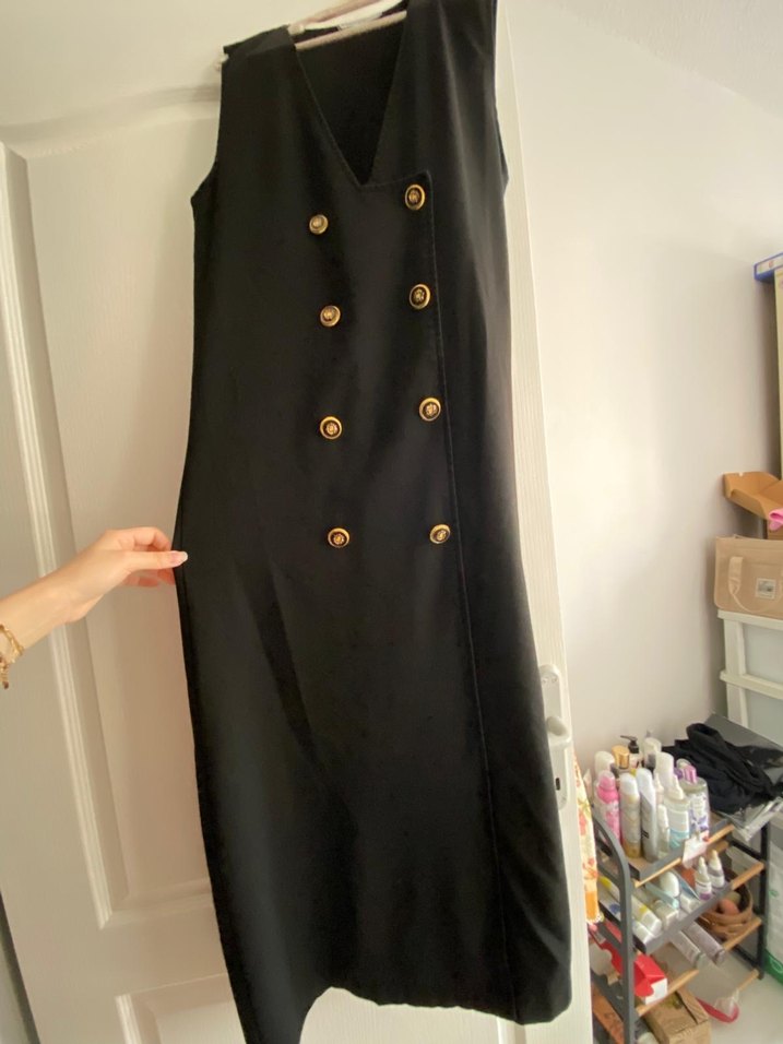 Düğmeli ön kısmı ve kesik yakasıyla siyah, kolsuz uzun elbise. Sentetik kumaştan, regular fit kesim. Ofis ve sokak stili için uygundur.