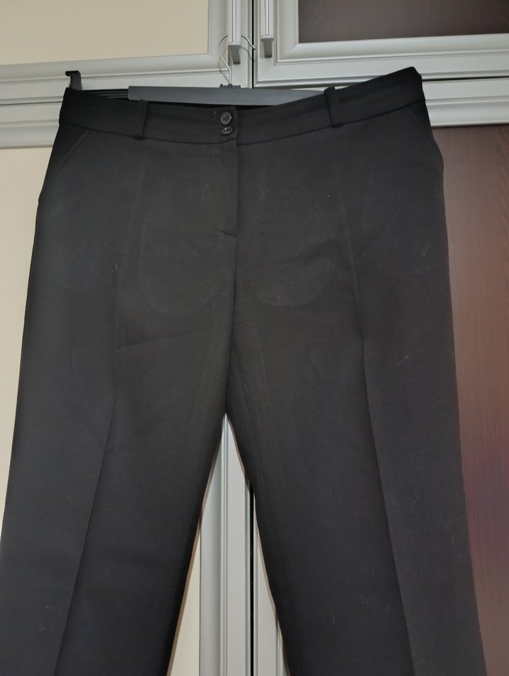 Düğmeli, normal boyda siyah kadın kumaş pantolon. bel.47cm boy.95cm beden 44 kusuru yoktur.kışlık kumaş ve orta beldir