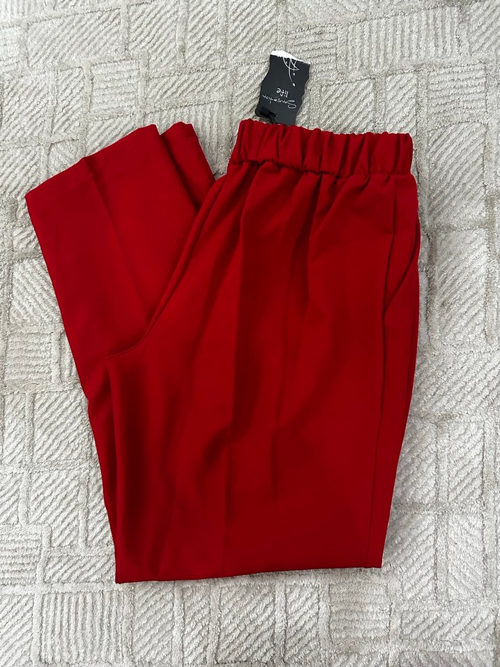 kırmızı renkli, normal boyda kadın kumaş pantolon. Hiç giyilmedi kumaşı ince 42 beden ancak 38/40a bence daha uygun