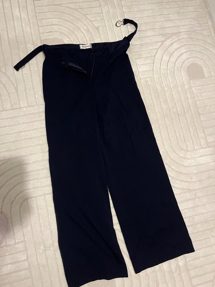 Siyah, kuşaklı, uzun ve bol kesim kadın pantolon. İpeksi dokusu ve minimalist sokak tarzıyla günlük kullanıma uygundur.M yazıyor ama s uygun