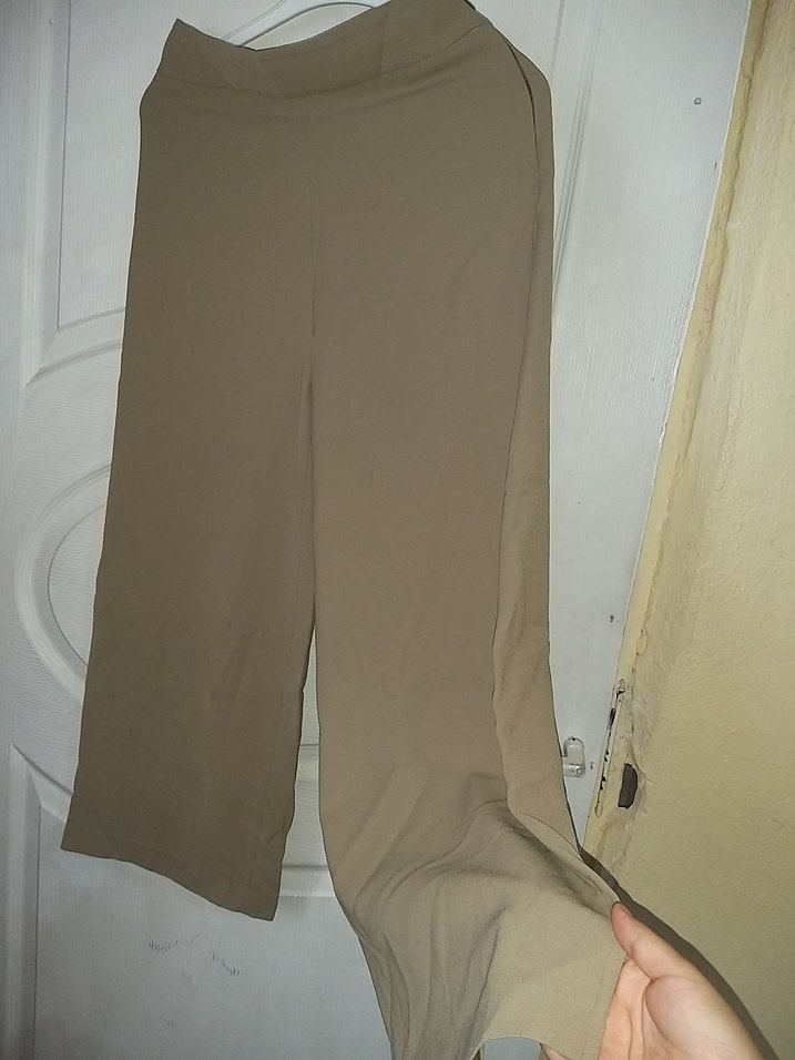 kadın bol paça kumaş pantolon açık Haki rengindedir Aynısının Pembesi de var yüksek beldir Çok kaliteli bir kumaşı vardır paçaları uzundur