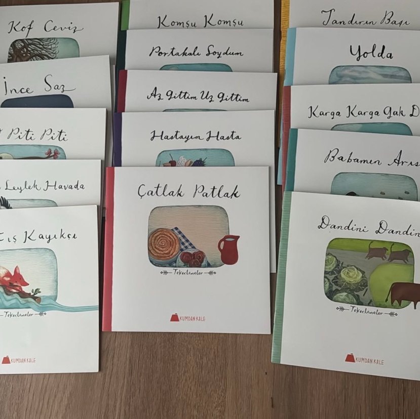 El yazısı başlıklı ve basit çizimlere sahip 16 çocuk kitabı seti, 'Çatlak Patlak' ve 'Karga Karga gak' gibi hikayeler içerir.
