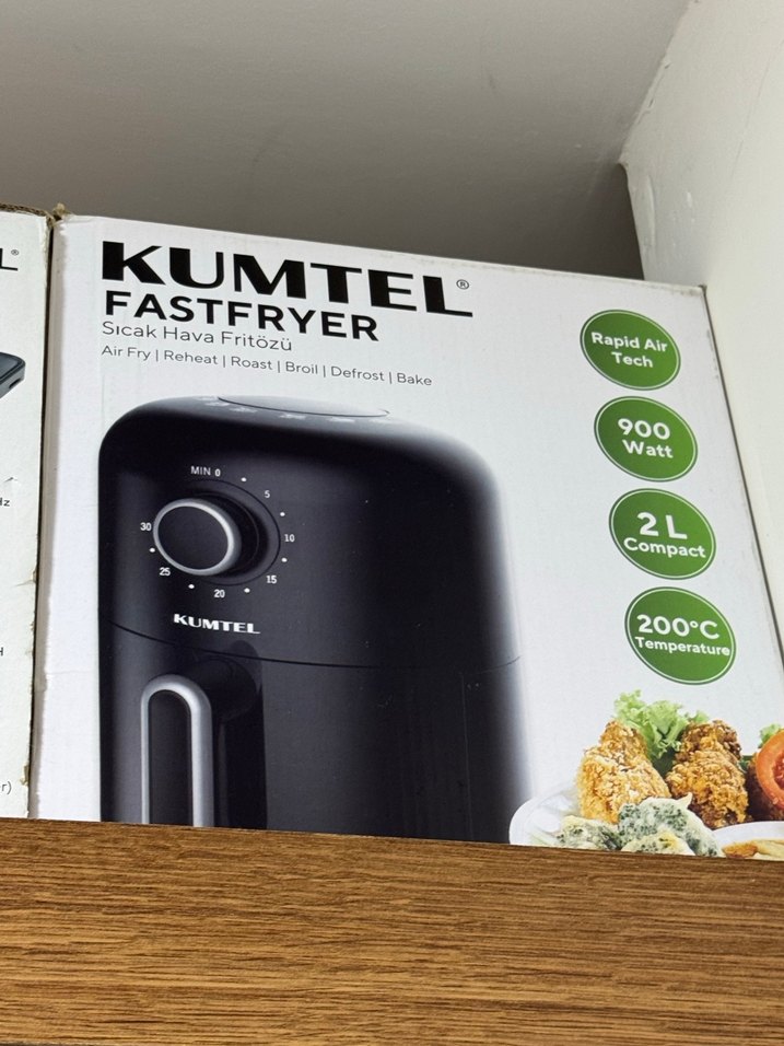 Kumtel FastFryer, 900 watt gücünde, 2 litrelik siyah renkli sıcak hava fritözü. 200°C'ye kadar ısıtma ve çoklu pişirme fonksiyonları sunar.