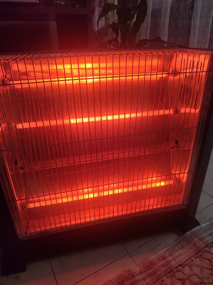 Koruyucu metal ızgara ve birden fazla ısıtma elemanı bulunan kırmızı elektrikli ısıtıcı .