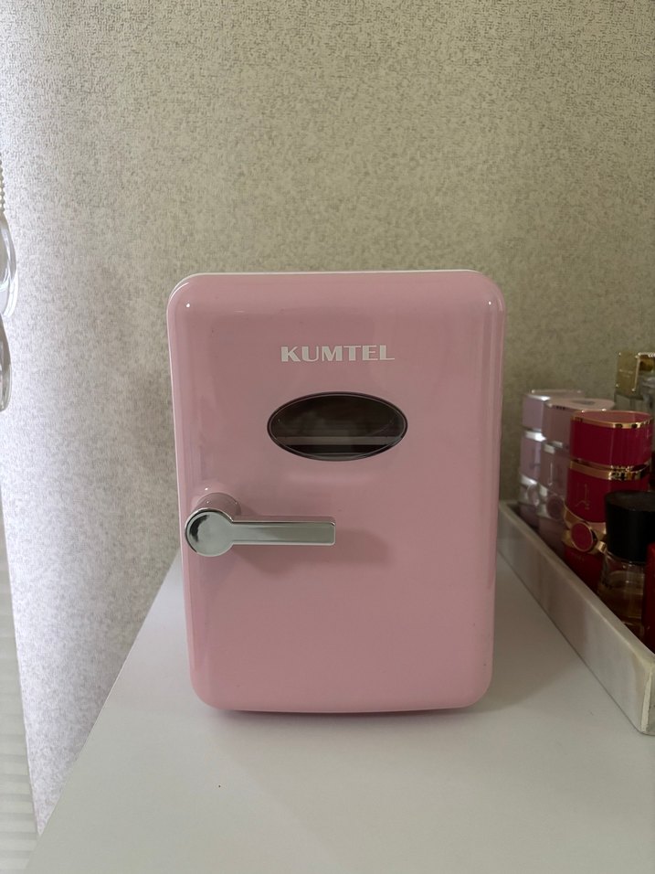 Pastel pembe renkte Kumtel mini buzdolabı, küçük pencere ve gümüş renkli kulp ile kompakt tasarıma sahiptir. Küçük alanlar için uygundur.