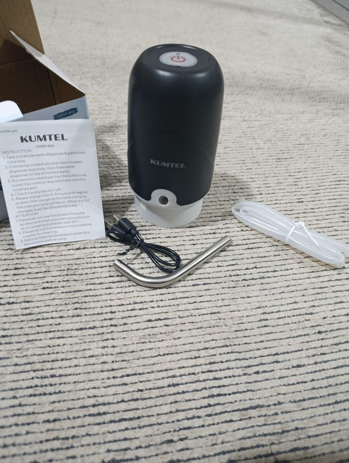 Kumtel siyah renkli şarjlı su pompası, üstte güç düğmesi ve USB şarj kablosu ile birlikte gelir. Metal musluğu sayesinde kolay su dağıtımı sağlar.