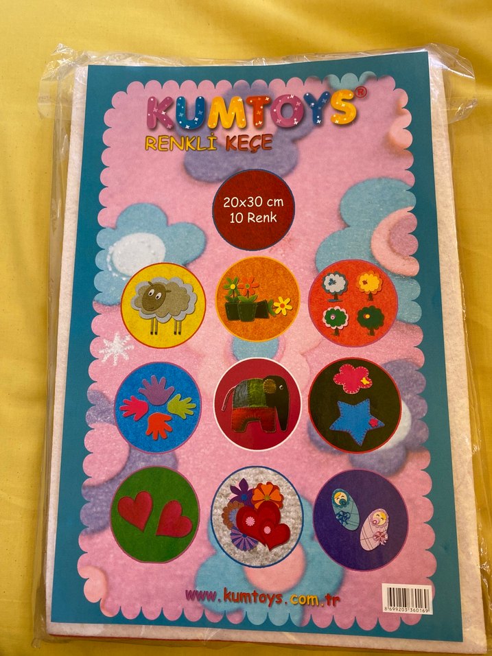 Kumtoys markalı, 20x30 cm ölçüsünde, 10 farklı canlı renkten oluşan renkli keçe seti. Yanında hediyesi ile birlikte gönderilecektir. Alana hayırlı uğurlu olsun.